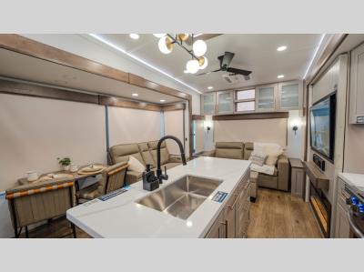 The Paradigm fifth wheels by Alliance RV are functional, high-quality, and luxurious for an unforgettable camping experience. There are three A/C units and a 40K BTU furnace to keep you comfortable year around, and you'll appreciate additional convenient amenities, like the all-in-one enclosed/heated utility center and the color coded and numbered wiring. A Helux Series coil spring pin box comes standard for hassle-free towing, along with Curt 8,000 lb. axles. You'll love the kitchen with its LG solid surface countertops and Lusso range, plus there is LED motion lighting in the pantry and a Maxx fan with a rain sensor to keep everything fresh when making dinner. Each model also includes an HD Smart TV in the living room and bedroom. And of course there are a variety of options you can choose from to further customize your fifth wheel; dual pane windows, Super Solar Plus, slide out awning toppers, and generator prep or a generator to name a few!
