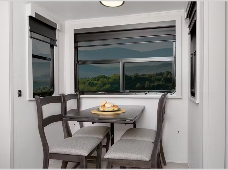 The 8' 4" wide body construction adds 4" of additional living space in the hallways, bedrooms and bathroom, and the on-demand water heater is a convenience you won't want to camp without. Each model also includes heavy duty Saliun G-rated tires for maximum towing security, a one touch, 6-point hydraulic level up system, and a carefree power awning with adjustable arms.