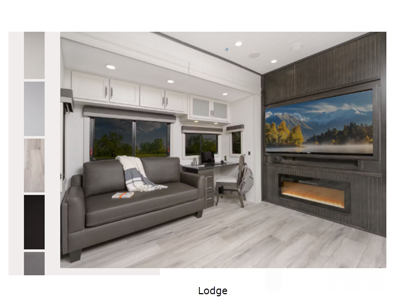 Sleeps 4 Slides 3 Length 37 ft 3 in Ext Width 8 ft 4 in Ext Height 13 ft 3 in Interior Color Lodge, Dovetail Exterior Color Blue Slate Full Body Paint, Copper Mist, Frost Black Hitch Weight 2560 lbs Dry Weight 13585 lbs Cargo Capacity 2915 lbs Fresh Water Capacity 75 gals Grey Water Capacity 83 gals Black Water Capacity 49 gals Tire Size 215/75R17.5H Furnace BTU 35000 btu Available Beds King Refrigerator Type Residential with Ice Maker Refrigerator Size 18 cu ft Convection Cooking Yes Cooktop Burners 3 Number of Awnings 2 Axle Weight 7000 lbs LP Tank Capacity 30 lbs Water Heater Type On Demand AC BTU 46500 btu TV Info LR 50" LED TV, BR Smart HDTV Awning Info 10' and 11' Carefree with Adjustable Arms Axle Count 2 Washer/Dryer Available Yes Number of LP Tanks 2 Shower Type Shower w/Seat Electrical Service 50 amp Similar Floorplans