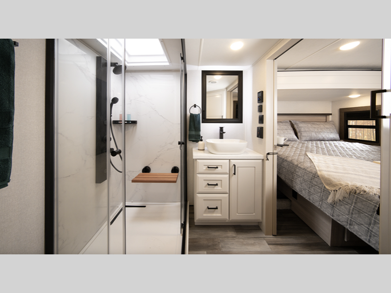 They come equipped with an impressive three 15,000 BTU A/C with quiet residential return air and a mandatory Four Seasons Package that will ensure your comfort year around, plus there are stainless steel kitchen appliances that give a residential touch to your space. The durable construction that includes a PVC roofing membrane will help extend the life of your fifth wheel, and the TravelLINK command system will put you in control of lighting, heating, and cooling for added convenience.