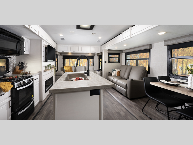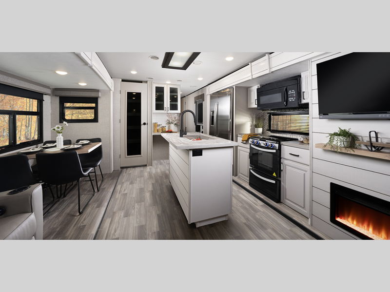 Sleeps 4 Slides 3 Length 37 ft 9 in Ext Width 8 ft 4 in Ext Height 11 ft 9 in Int Height 7 ft Interior Color Coastal Linen Hitch Weight 1275 lbs GVWR 11500 lbs Dry Weight 9465 lbs Cargo Capacity 2035 lbs Fresh Water Capacity 50 gals Grey Water Capacity 114 gals Black Water Capacity 31 gals Tire Size ST235/80R16E Furnace BTU 30000 btu Available Beds Queen Refrigerator Type 110V Residential Refrigerator Size 21 cu ft Cooktop Burners 3 Number of Awnings 2 LP Tank Capacity 30 lbs Water Heater Type Tankless AC BTU 30000 btu TV Info LR Smart HDTV Awning Info 11' 6" and 14' Power with LED Lighting Axle Count 2 Washer/Dryer Available Yes Number of LP Tanks 2 Shower Type Standard Electrical Service 50 amp Similar Floorplans