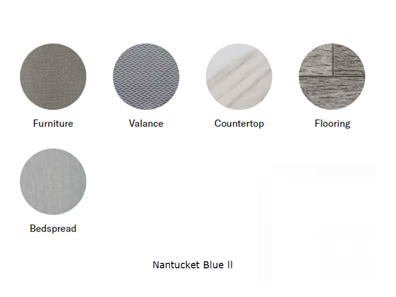 Sleeps 6 Length 29 ft 9 in Ext Width 8 ft 3 in Ext Height 11 ft Int Height 7 ft Interior Color Nantucket Blue ll, Sunlit Silver Exterior Color Standard Graphics Hitch Weight 8000 lbs GVWR 14500 lbs Fresh Water Capacity 40 gals Grey Water Capacity 22 gals Black Water Capacity 25 gals Furnace BTU 30000 btu Generator 4.0 kW Gas Fuel Type Gasoline Engine 7.3L V8 Chassis Ford E Series Horsepower 325 hp Fuel Capacity 55 gals Wheelbase 190 in Number Of Bunks 1 Available Beds RV Queen Torque 450 ft-lb Refrigerator Type 12V w/Auto Generator Start Cooktop Burners 3 Shower Size 24" x 32" Number of Awnings 1 LP Tank Capacity 40 lbs Water Heater Type Tankless AC BTU 15000 btu Basement Storage 108.8 cu. ft. TV Info Cab 40" Smart TV Awning Info 14' Power w/Integrated LED Lighting Gross Combined Weight 22000 lbs Shower Type Standard Electrical Service 30 amp Similar Floorplans